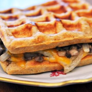 Waffle sandwich de hongos salteados, alfalfa y vegetales.